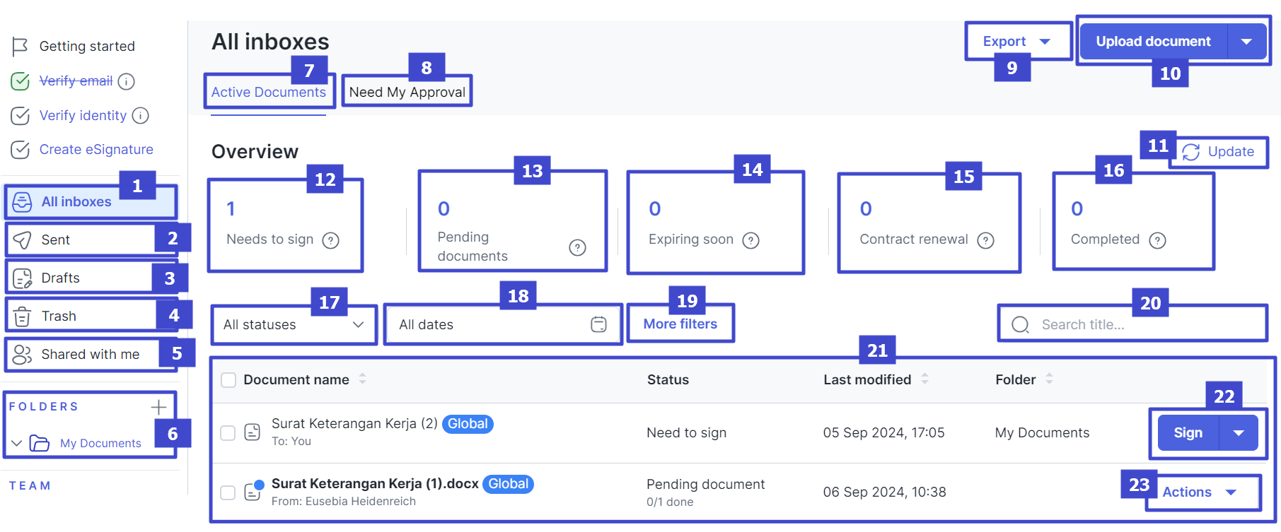 | 21 | Document table | Displays all documents entered into your account, both those that have been signed and those that still need to be signed. |