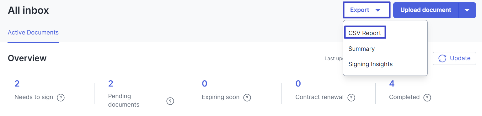 - You can set the time period and status of the document you want to download the usage report. Then click "Export CSV".