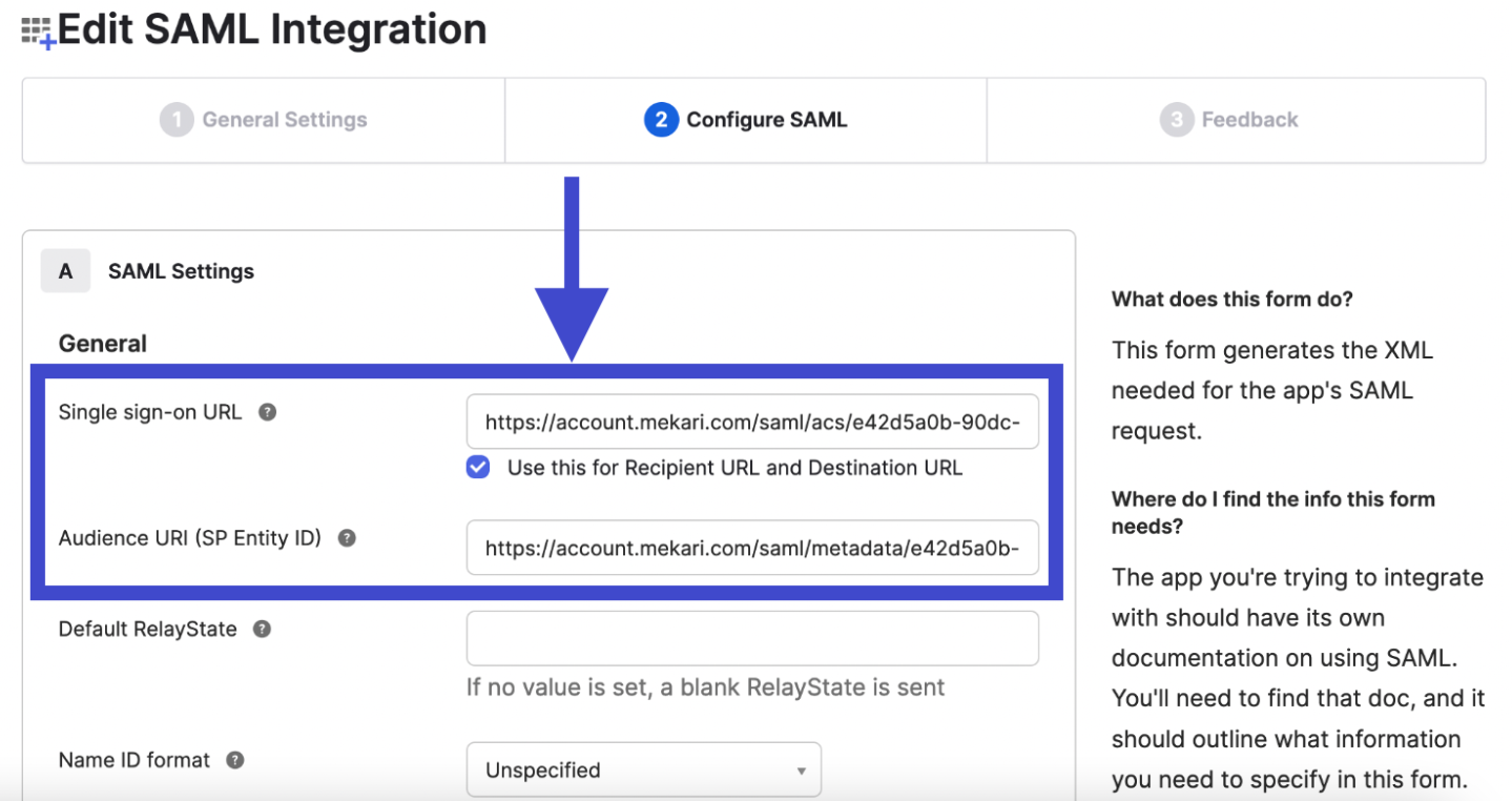 - Then you will be directed to the Configure SAML tab, where you can fill in the Single sign-on URL and Audience URL (SP Entity ID) with https://account.mekari.com/users/sign_in as a temporary placeholder.