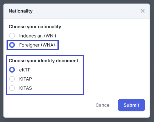 Then in the Nationality pop-up that appears, select Foreigner (WNA) and select the identity document to be used.