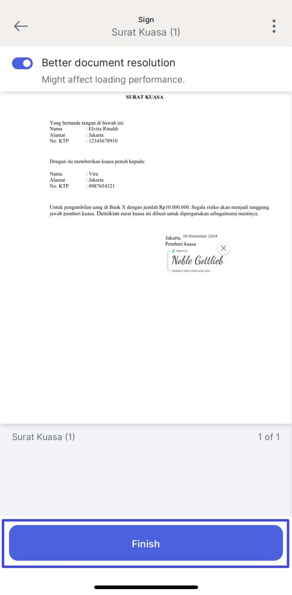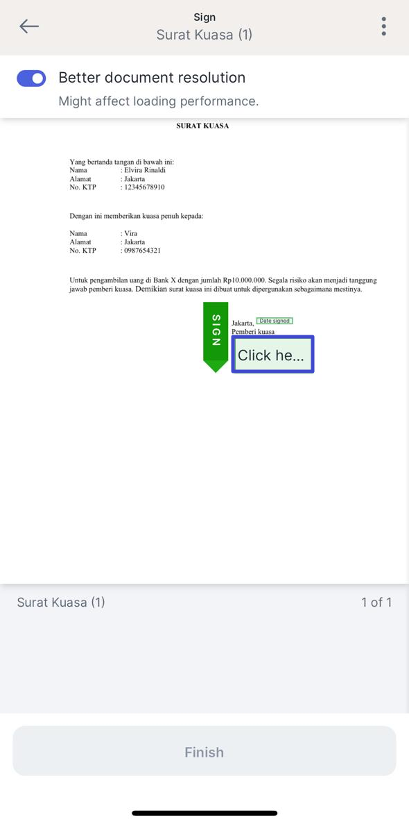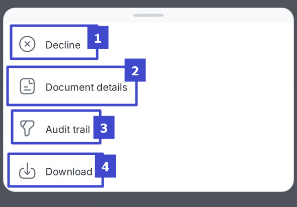 No Column Explanation 1 Decline Click to cancel signing the document. 2 Document details Click to view document details. 3 Audit trail Click to see activity related to that document. 4 Download Click to download the document. - You can see the contents of the document more clearly by sliding the toggle Better document resolution.