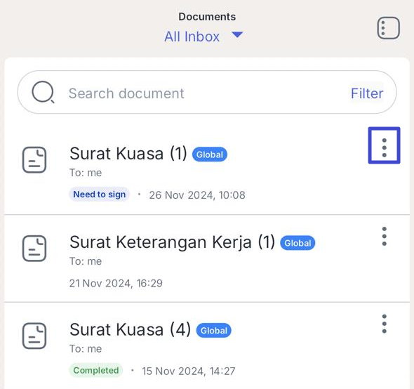 - Select one of the documents you want to sign and then click the “three dots” next to the document name.