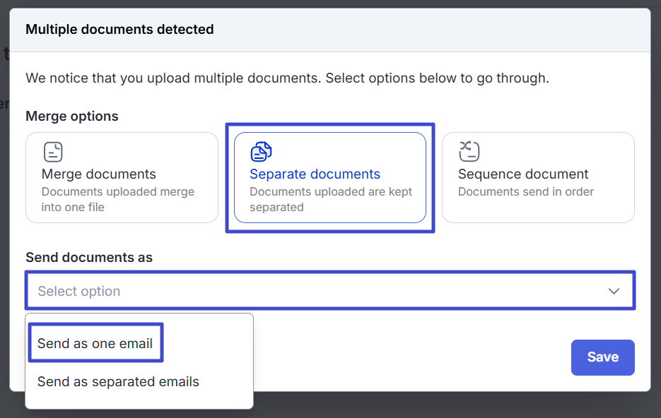 8. Afterward, choose which documents will be combined into a single email. The next pop-up will then show up. The "Merge documents" option allows you to combine documents into a single file, while the "Separate documents" option allows you to upload documents separately. If you select 'Separate documents', click "Send as one email" to send the documents in a single email. Then, click "Save".
