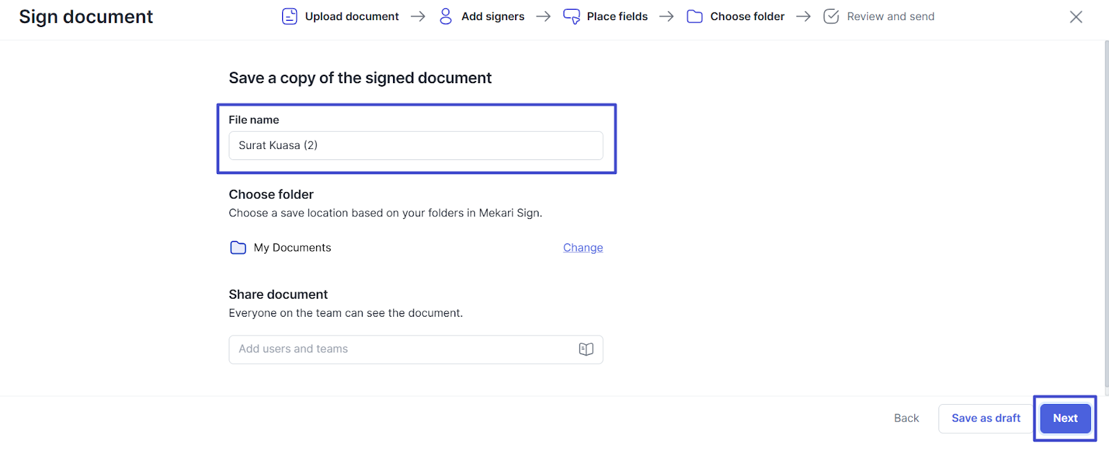 38. Click "Save as draft" to save the document as a draft and click "Next" to continue.