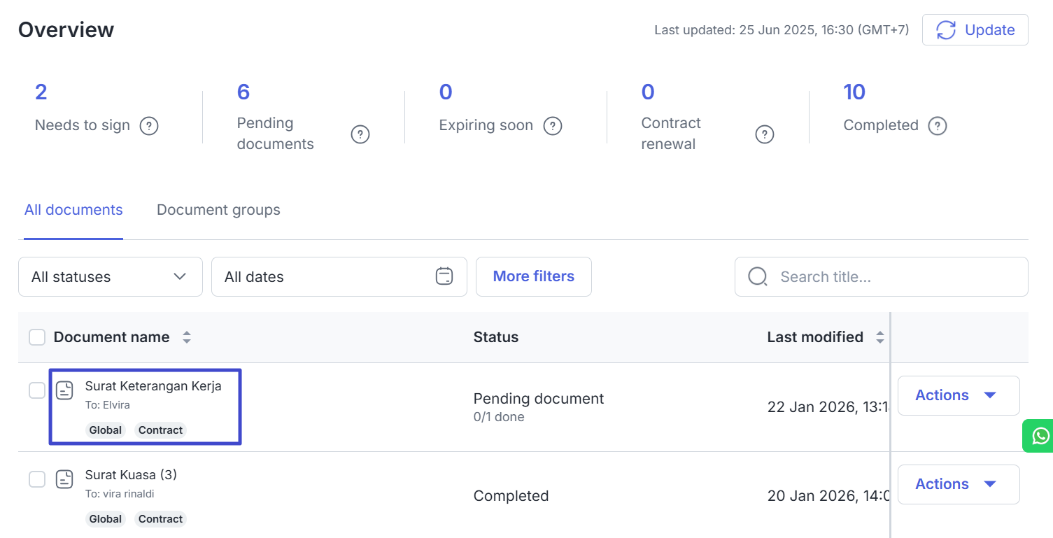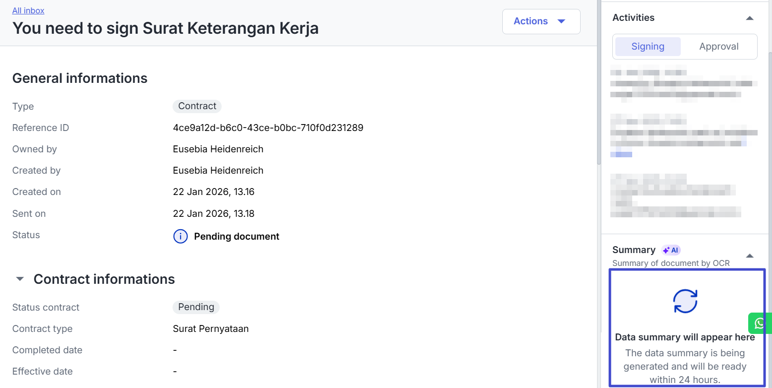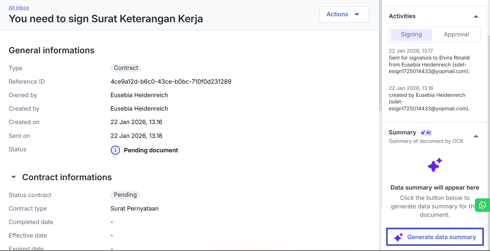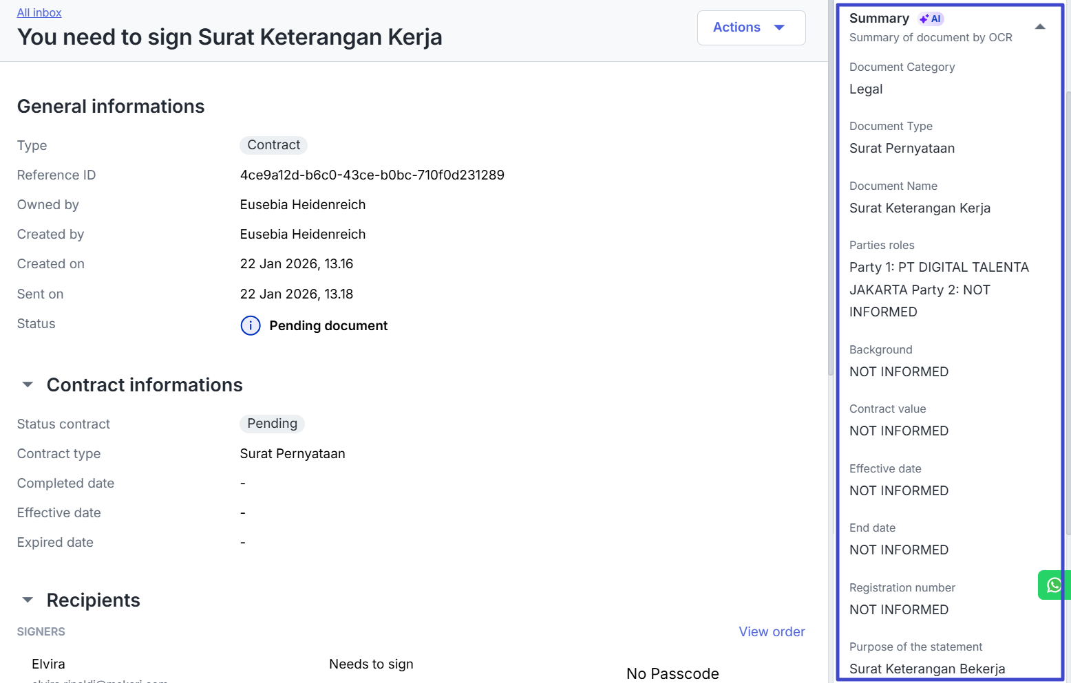 Now, you can easily view a summary of key information in a document without having to open it. With the AI-powered Summary feature, Mekari Sign offers an easy way to track key metrics, such as contract status, renewal dates, or document compliance, in real-time.