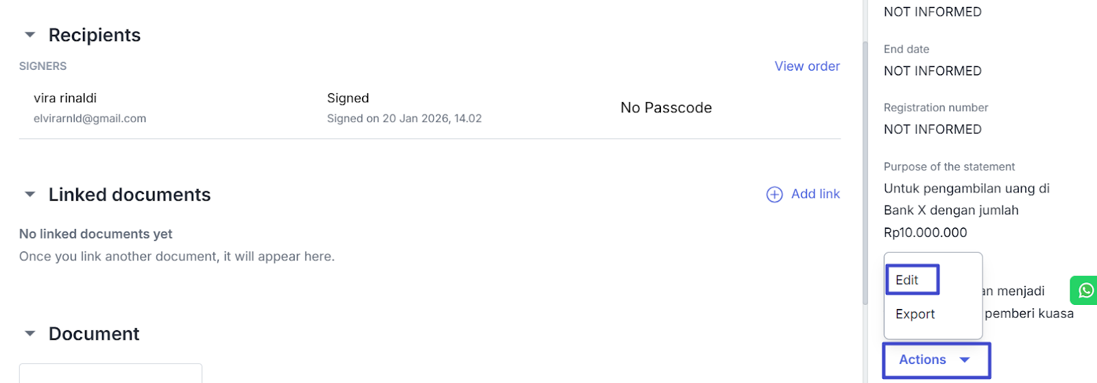 If you are the Document maker, you can edit the summary result by clicking the “Actions” button and selecting Edit.