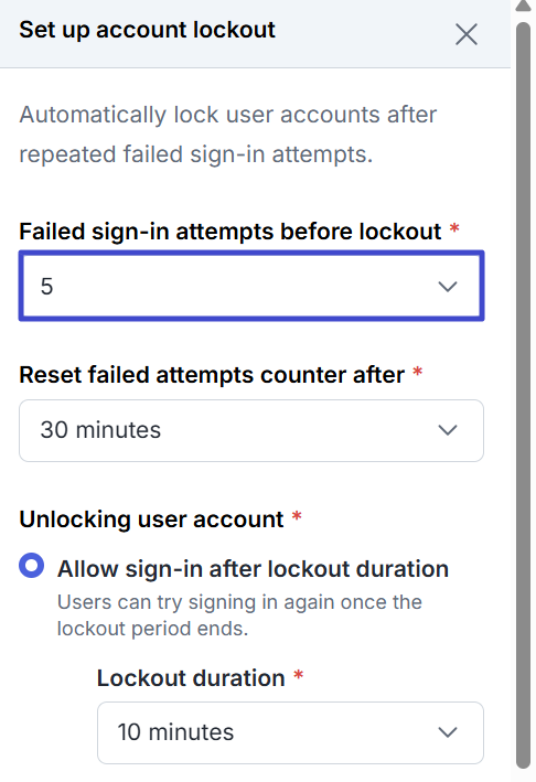 A pop-up will appear as follows. In the Failed sign-in attempts before lockout section, select after how many attempts the account will be locked.