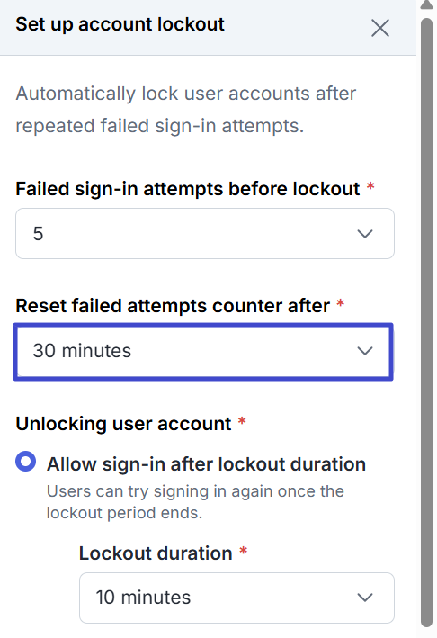 Next, in the Unlocking user account section, there are three options you can choose from. First, Allow sign-in after lockout duration, where you can set the duration (minutes) the account will be locked before it automatically unlocks.