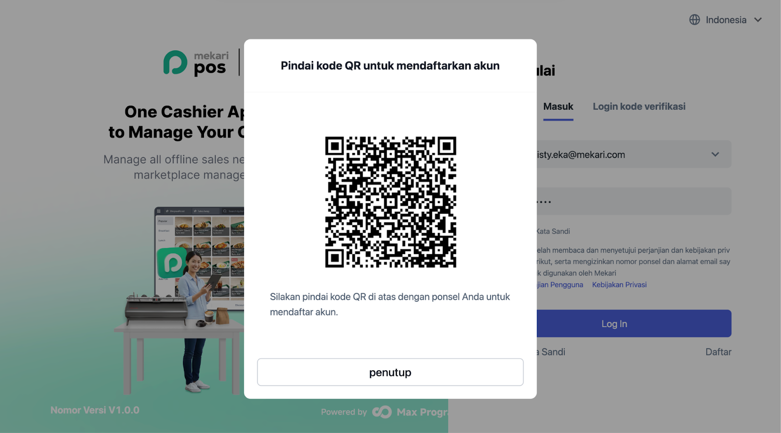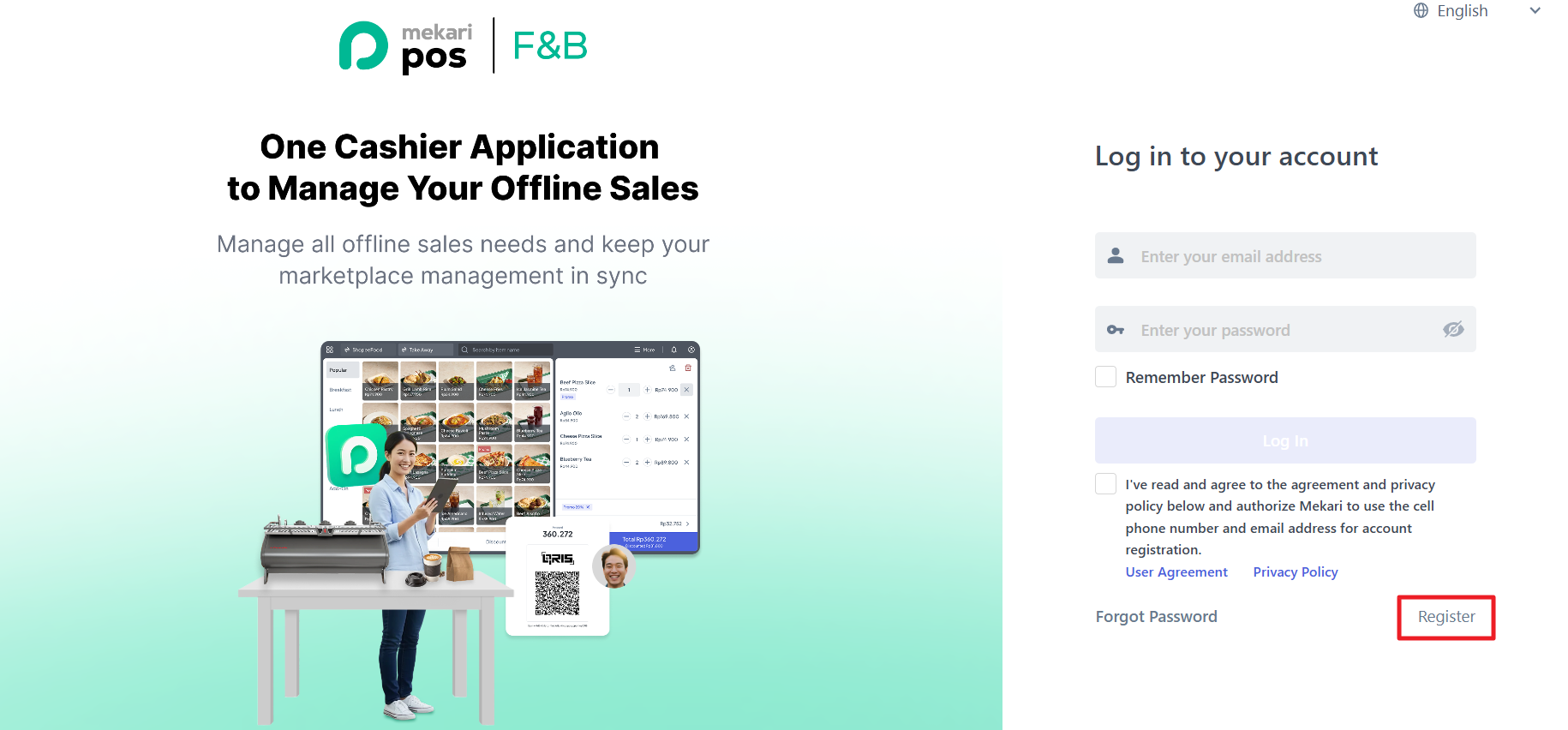 You can also register an account through the Kasir application by clicking “Register Now” and scanning the QR Code to go to the Mekari POS F&B Back Office
