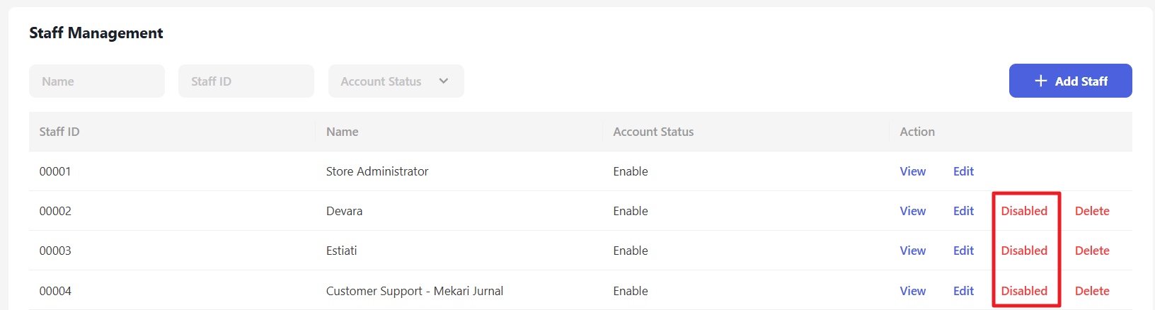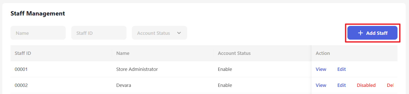 The added staff will appear in the following list. You can view details by clicking “View” or edit by clicking “Edit”.