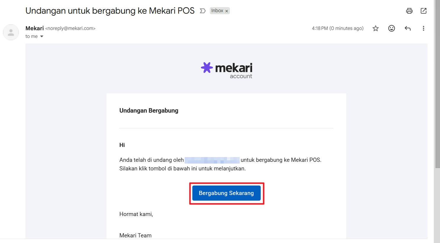 b. One staff email can be added to different stores with the same password. When staff log in for the first time, they need to verify their Mekari account via email with the email subject: Invitation to join Mekari POS, then click “Bergabung Sekarang”.