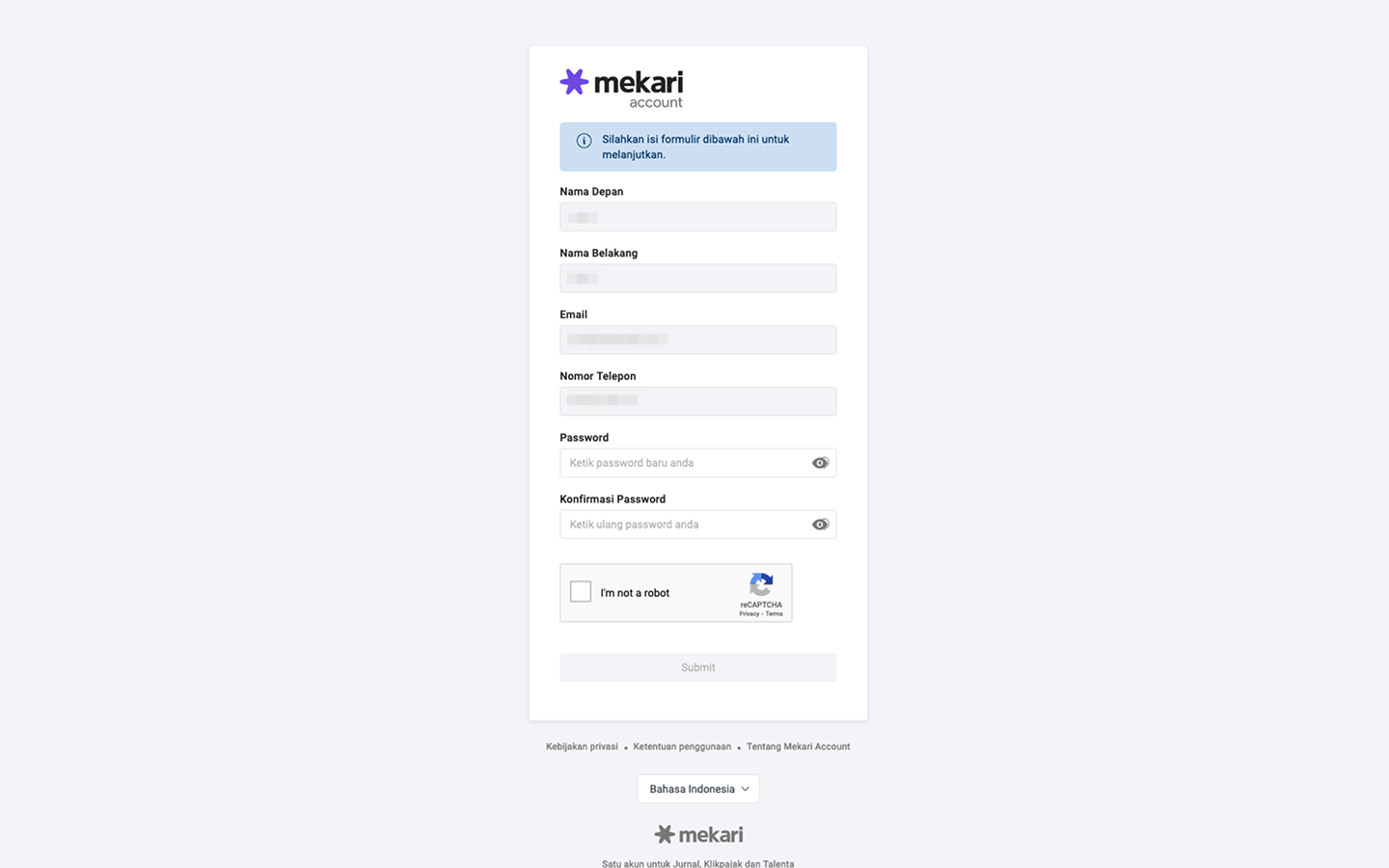 After clicking “Bergabung Sekarang”, you will be directed to the Mekari account creation page if you do not have a Mekari account. You need to fill in the password, confirm the password, and check “I’m not a robot”. The account and password entered on this form can be used to register for other Mekari products and services.