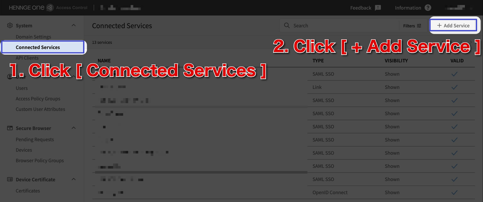 Log in to the HENNGE Access Control Management Console using an administrator account, then select the Connected Services menu and click the “+ Add Service” button.