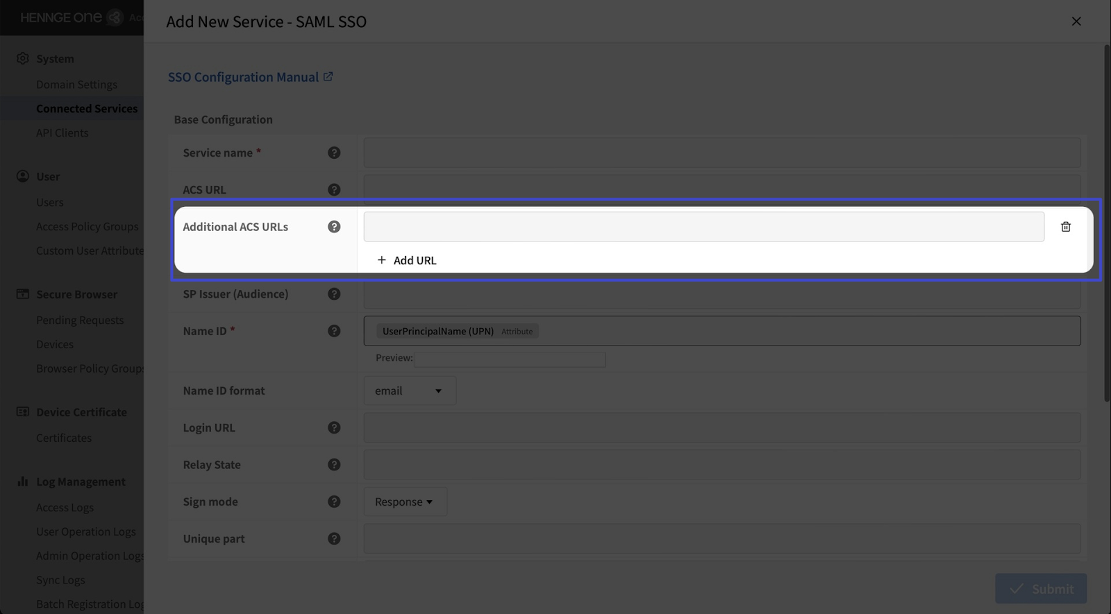 Some services may require you to enter additional ACS URLs. If needed, click “Add URL” and then enter the additional ACS URLs you obtained.