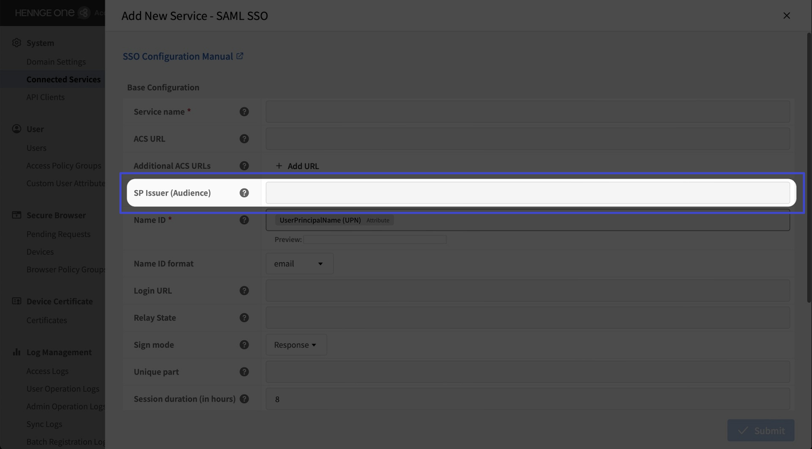 Some services require a unique IdP Issuer (Audience). If needed, enter a unique identifier (entity ID) for each service in the “Unique part” field.