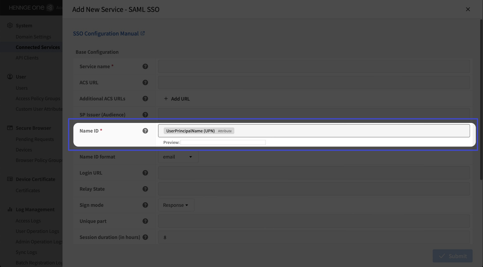 In this section, make sure the Name ID matches the login ID used in the SP service. If the login ID in the SP service is not an email address, then the Name ID must be set to a format other than email.