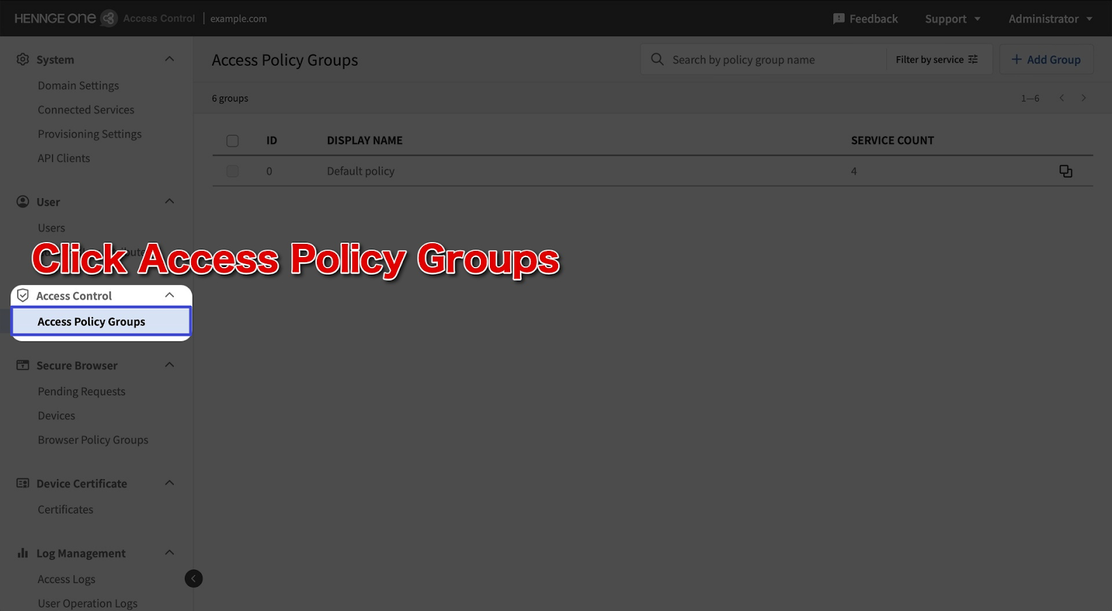 To configure access permissions based on groups, go to the Access Policy Groups menu in the HENNGE Access Control Admin Console.