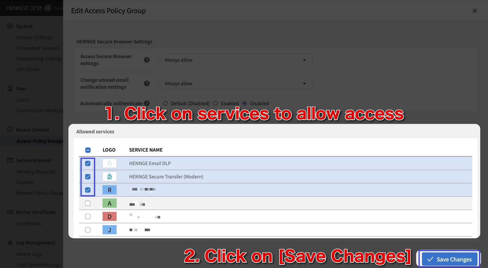 To enable access, check the box next to the SP service you want to allow, then click “Change”.