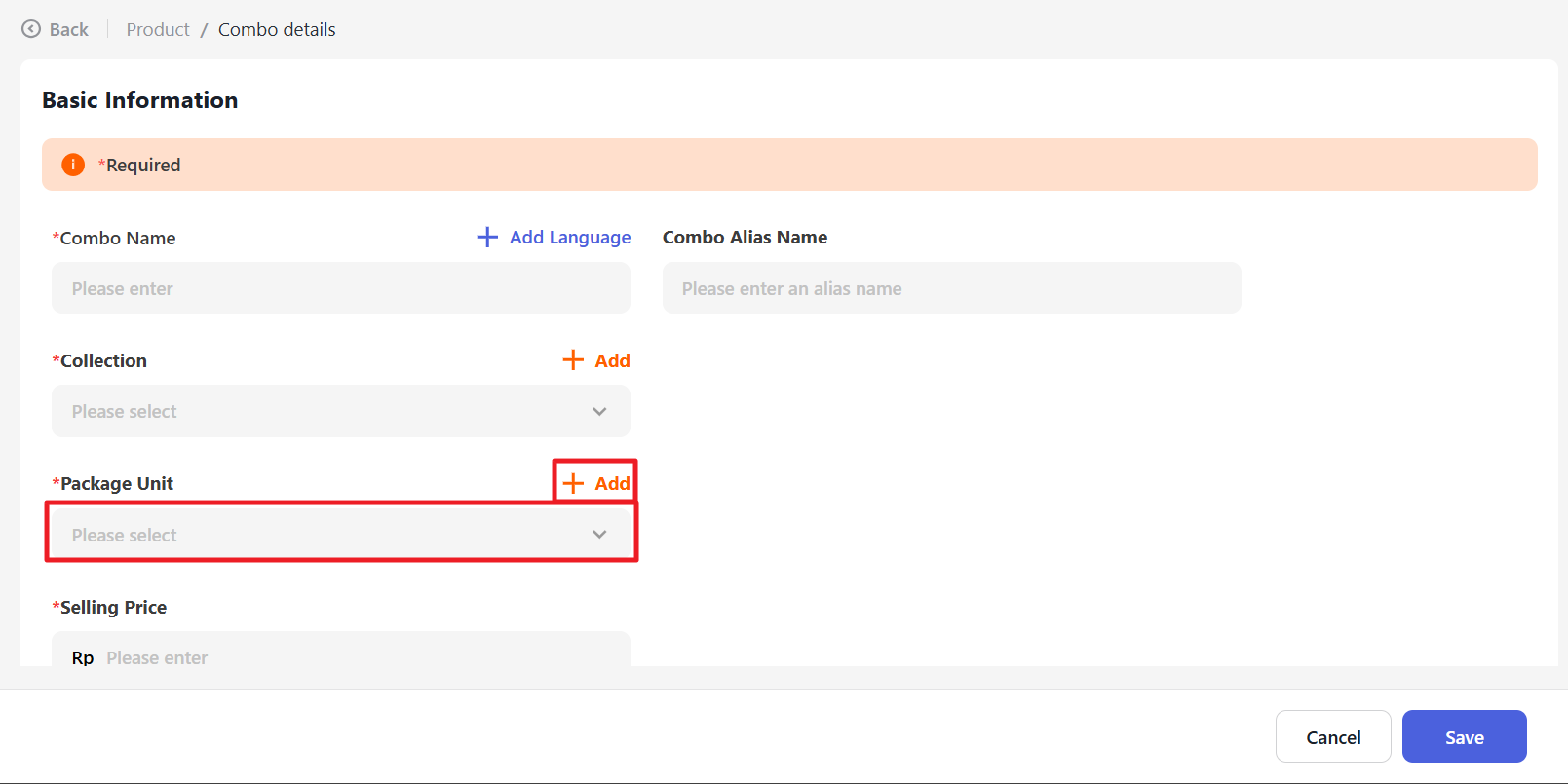 Select the Package Unit you have created or click “+ Add” to add a new unit.