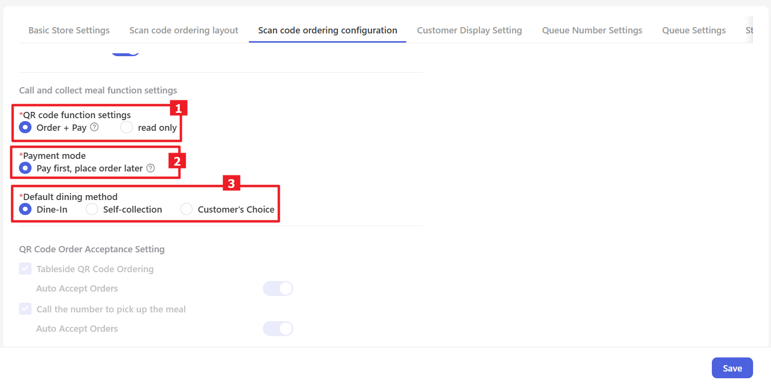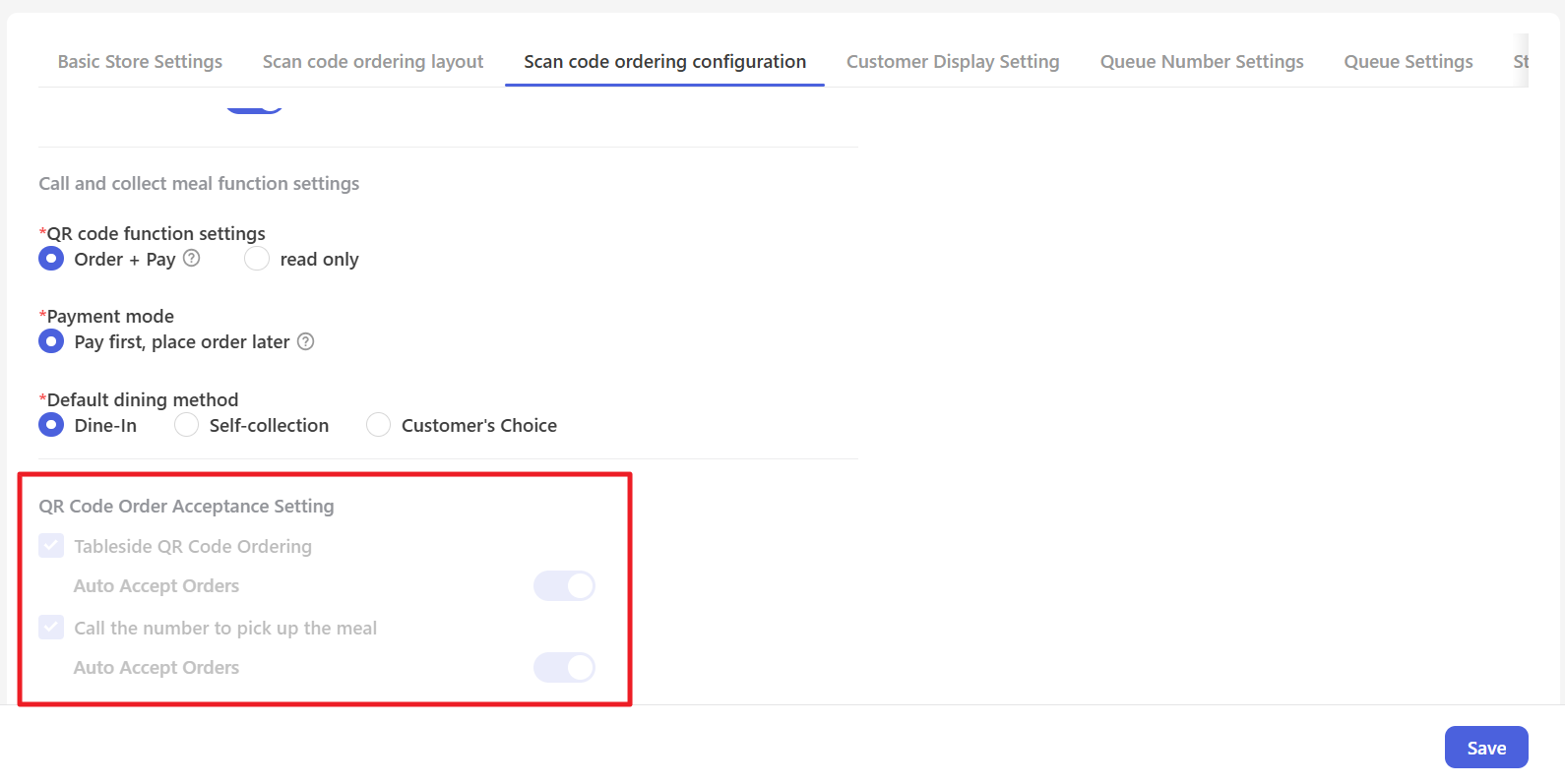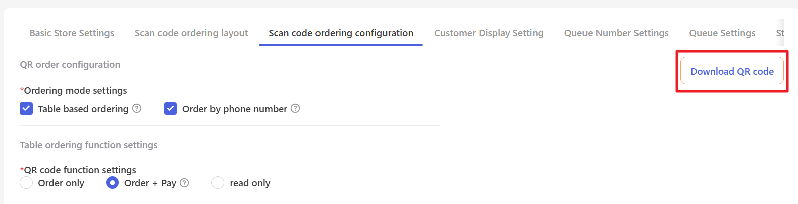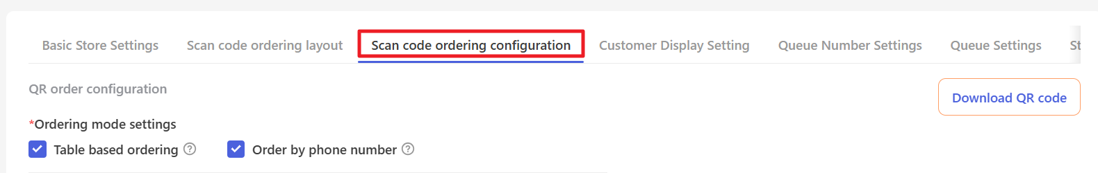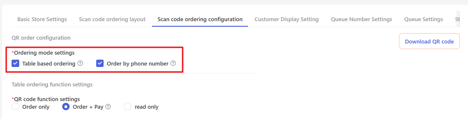 In the QR Code Configuration section, there are two options for Order mode settings, namely: Table-based ordering and Order with table number.