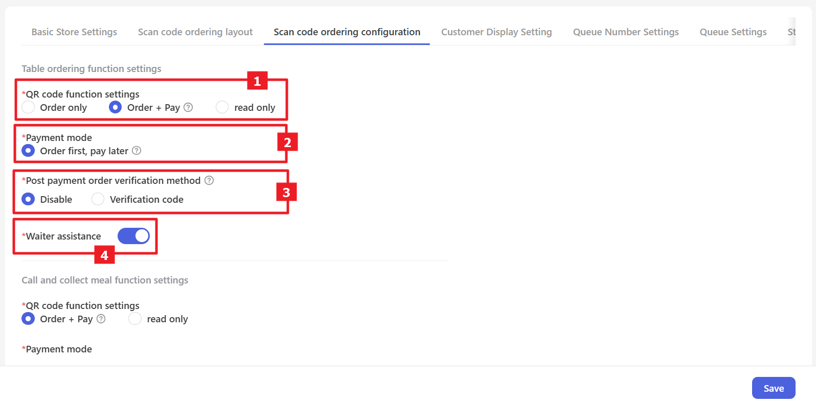 4 Waiter assistance Enable this toggle if you want to add a call button for the cashier when customers are on the QR code page. The cashier will receive a call notification for the table number that pressed for waiter assistance. -