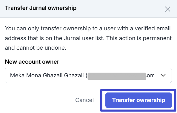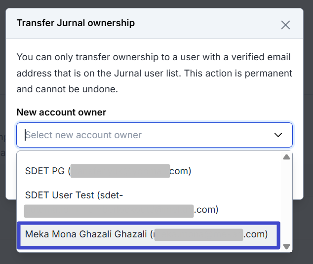 Then the following display will appear. Choose one of the emails to which you want to transfer Ownership. In this case, Ownership can only be transferred to users who have a verified email and are registered in Mekari Talenta (this rule also applies to other Mekari products), and this process is permanent and cannot be undone.