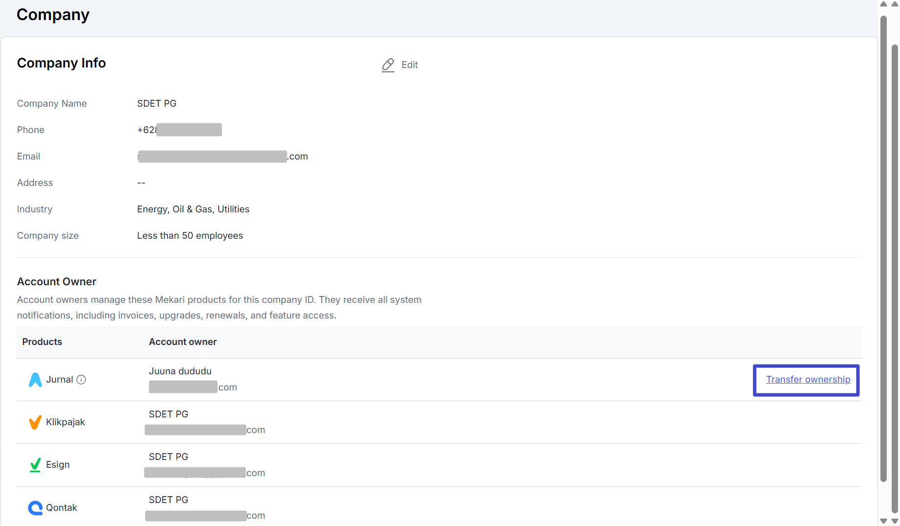 In managing a company account, there is the role of Account Owner as the primary owner of the account in SSO. This guide explains how to transfer the Account Owner role to another user within the same company. The transfer can only be done if the company has more than one user and is performed by the Account Owner through the Mekari account in the company menu. This role can only be transferred to another eligible user, namely a user who already has a verified email in SSO.