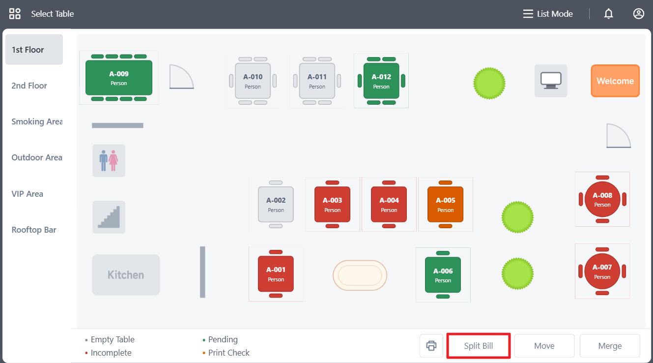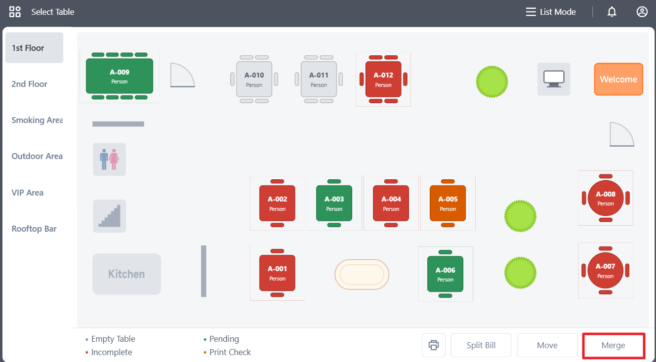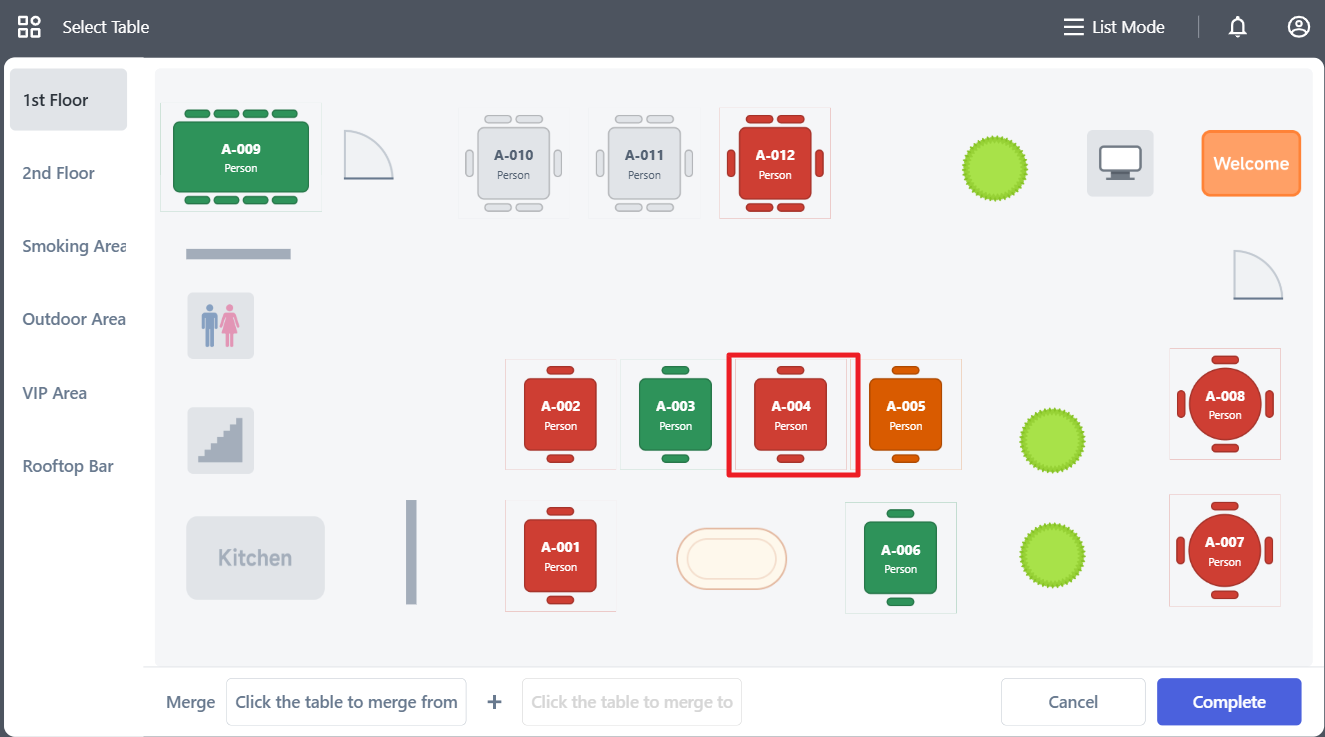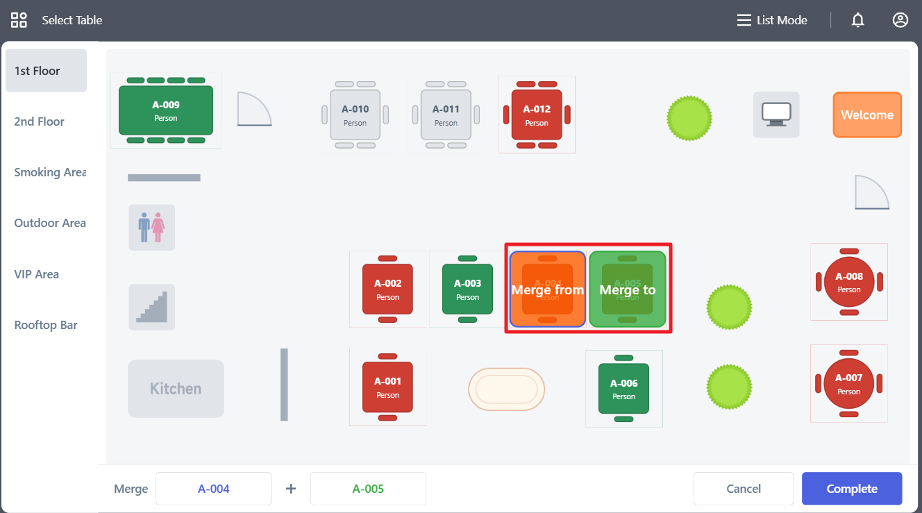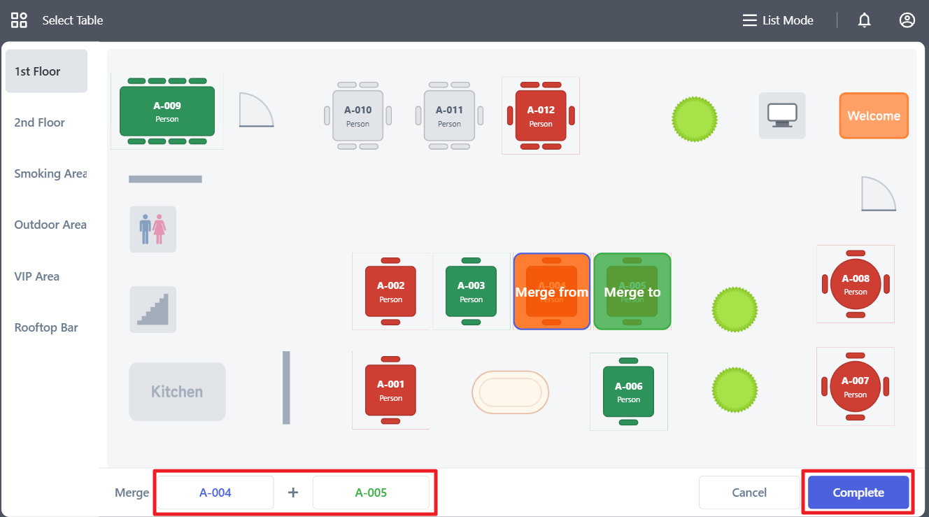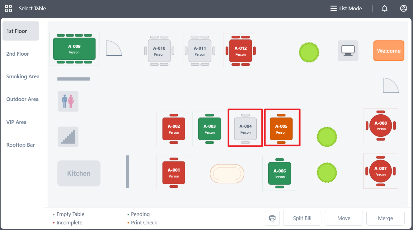 Then click the second “table number” as the merge destination. Here, the orders from table number A-004 (Merge from) will be merged into table A-005 (Merge to) so the bill will be under table number A-005.