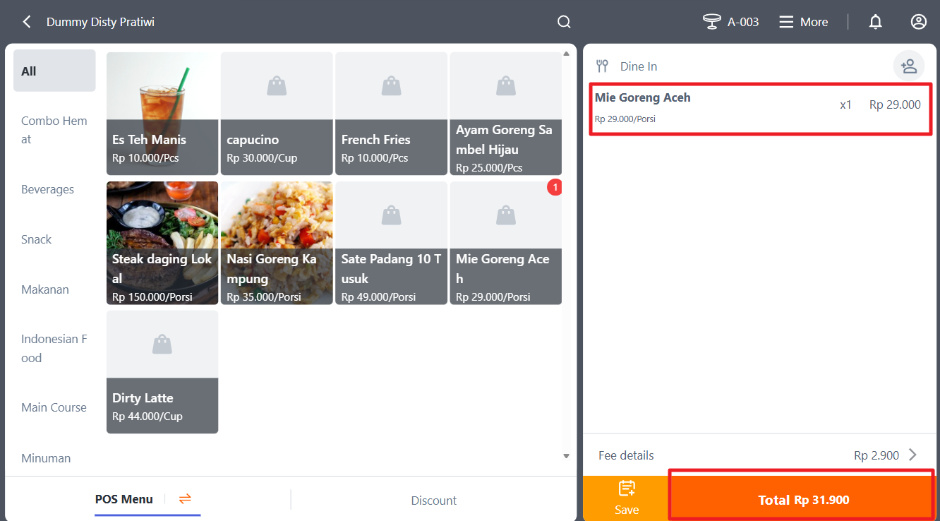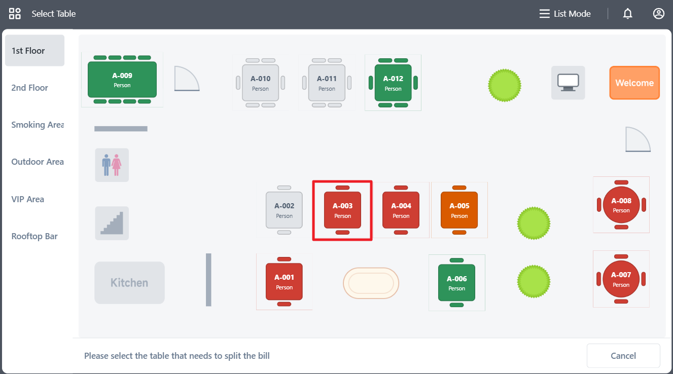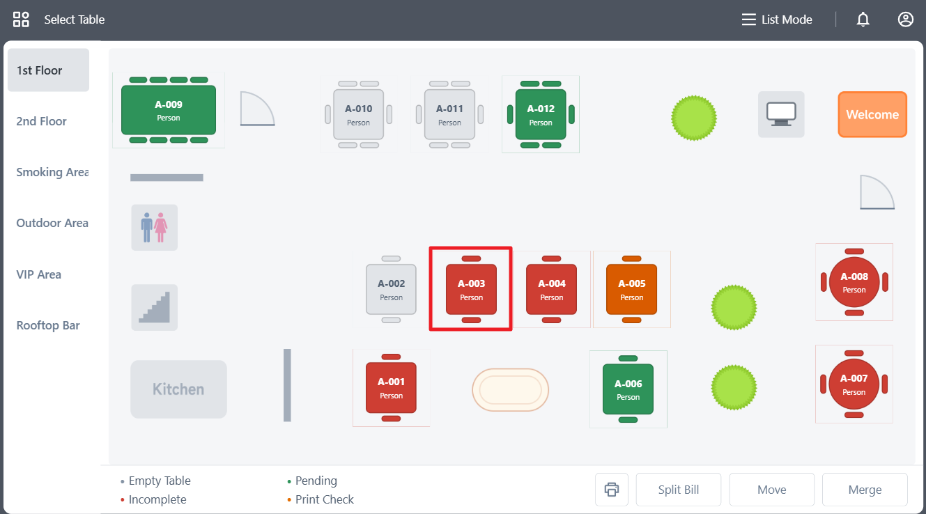 Click the first "table number" whose bill you want to merge. For example, we will merge the bills from tables A-003 and A-004.