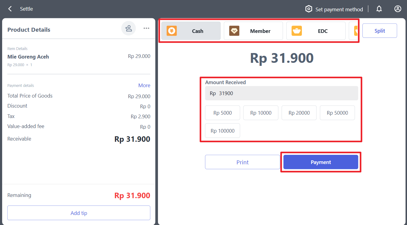 Choose the payment method the customer wants, enter the amount received, and click “Payment”.