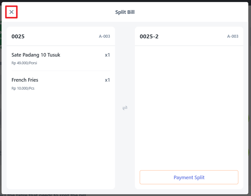 Next, you will see the following display. You can split the orders again by following the previous steps, or you can click the “x” button to exit the split bill pop-up.