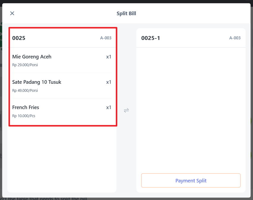 The selected orders will move to the right column, and if the orders are correct, click “Payment Split”.