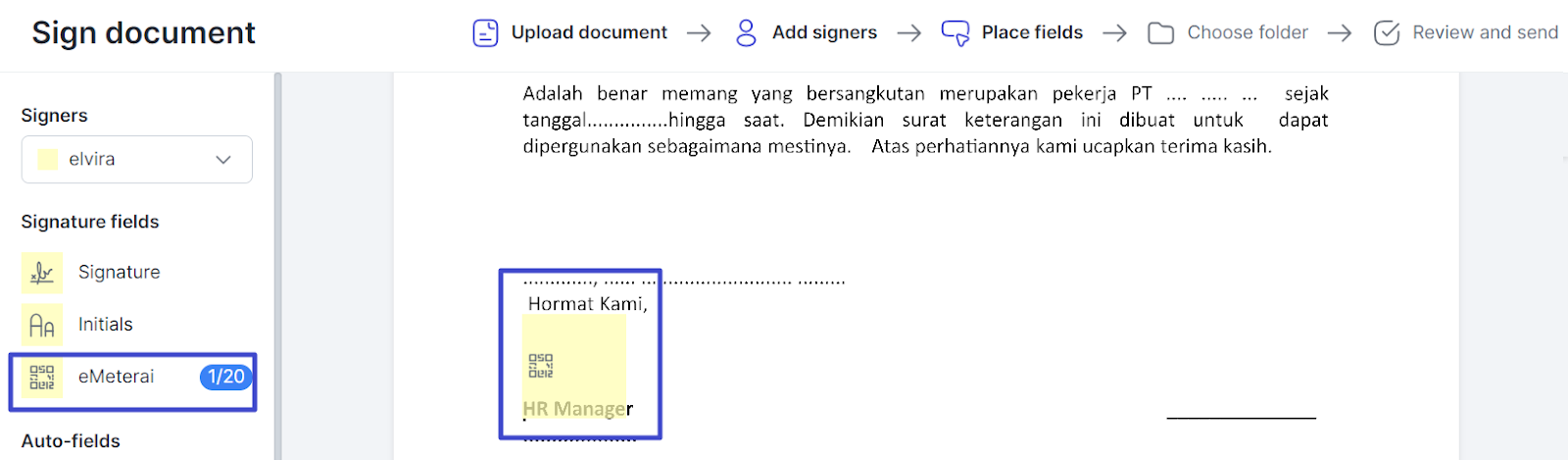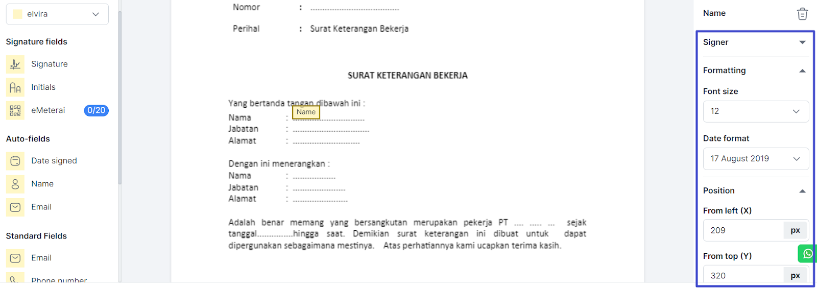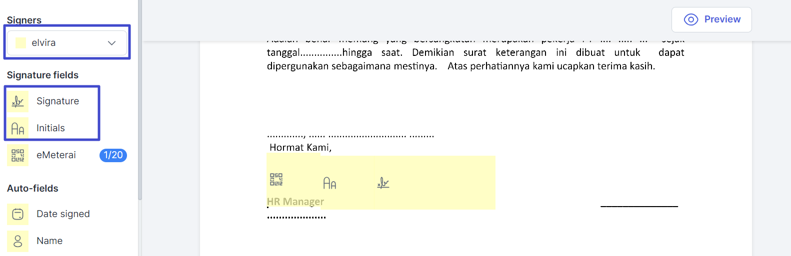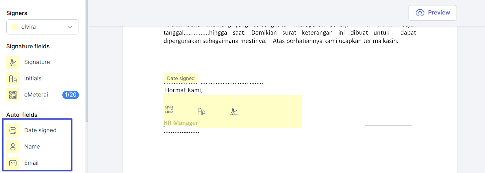 Sebagai informasi, apabila salah satu atau lebih penandatangan yang ada pada dokumen belum terverifikasi eKYC, maka pembuat dokumen akan mendapatkan informasi bahwa pembuat dokumen akan dikenakan biaya untuk saldo eKYC. Anda dapat menambahkan Auto-fields berupa Data signed, Name dan Email, sesuai yang Anda tambahkan pada tahap Add signers.