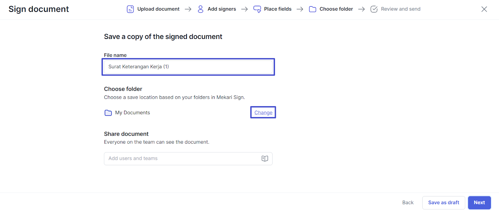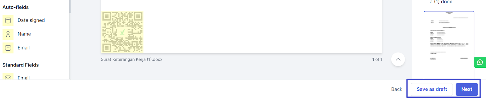 Klik "Save as draft" untuk menyimpan dokumen sebagai draft dan klik "Next" untuk melanjutkan.