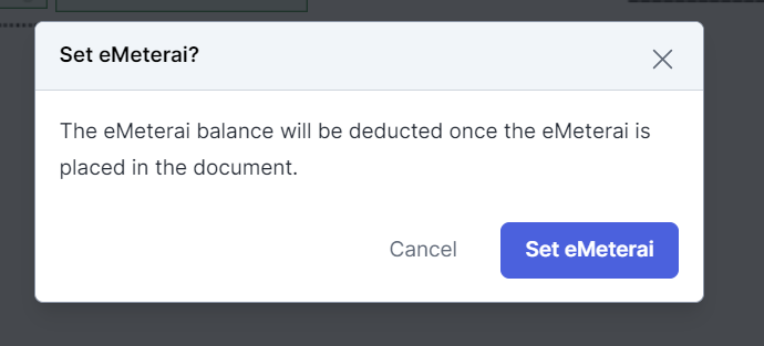 - Namun apabila Anda tidak mencentangnya, maka Anda akan melihat pop up notifikasi berikut saat meletakkan eMeterai saat tahapan sign dokumen. Dan apabila Anda klik "Set eMeterai" maka eMeterai akan terpasang dan kuota eMeterai akan terpotong. -