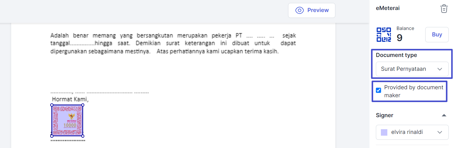 Pilih tipe dokumen dan centang Provided by document maker apabila eMeterai disediakan oleh pembuat dokumen.
