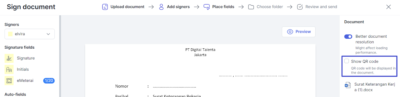 Centang checkbox Show QR Code, untuk menambahkan kode QR pada dokumen.