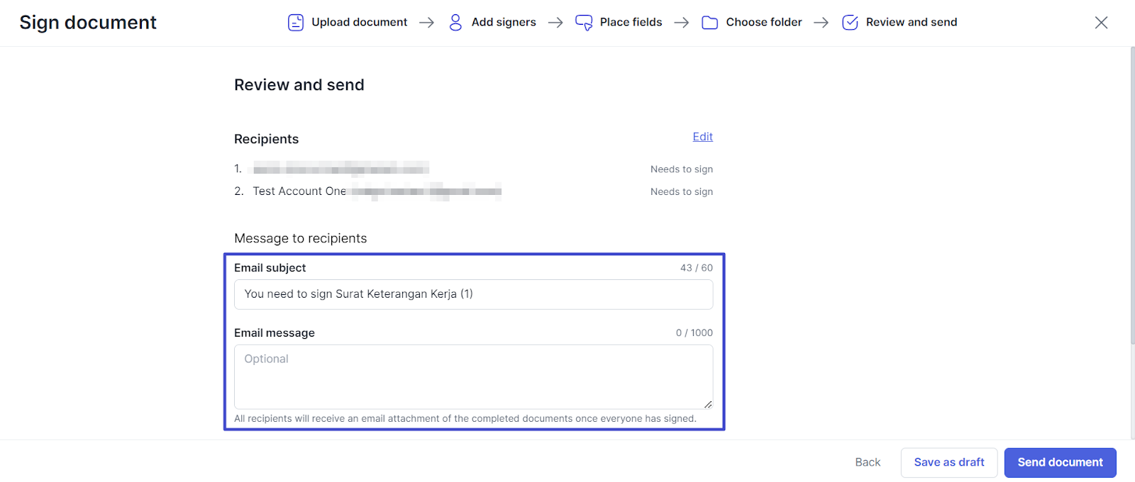 Apabila semua informasi yang ingin dicantumkan ke dalam dokumen sudah lengkap, Anda dapat klik "Send document" untuk mengirimkan dokumen ke email penerima yang sudah Anda daftarkan atau klik "Save as draft" untuk menyimpan dokumen sebagai draft.