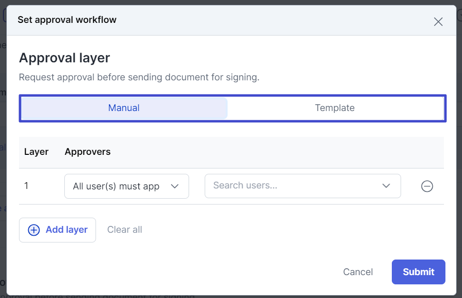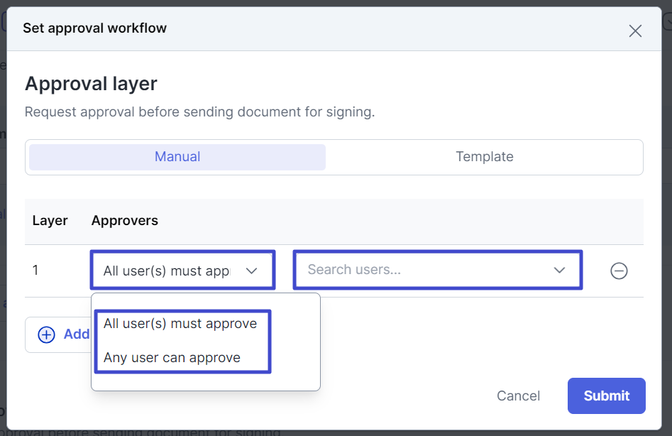 Anda dapat menambahkan approval baru dengan memilih Manual atau Template untuk memilih approval yang telah Anda buat sebelumnya.