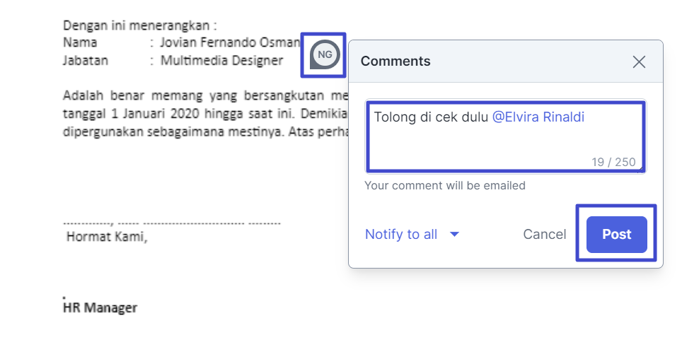 Klik ikon “tanda tambah” untuk memberikan komentar, letakkan bubble pada posisi yang diinginkan dan masukkan komentar pada kolom yang tersedia, klik “Post” untuk mengirimkan komentar.