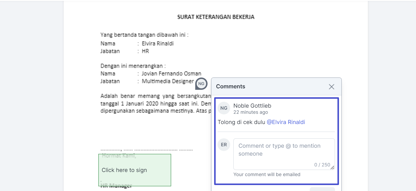 Komentar dapat dilihat oleh penandatangan saat melakukan tandatangan seperti berikut.