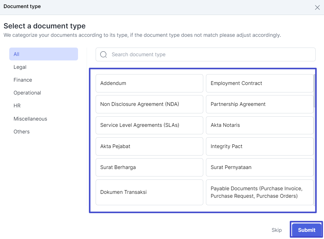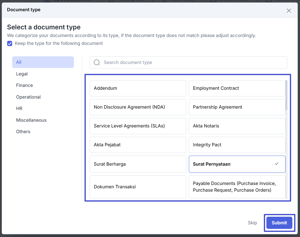Pada tahap Upload document, terdapat fitur AI yang akan dengan mudah mendeteksi tipe dokumen yang akan Anda unggah. Dalam hal ini, Anda tidak perlu memilih tipe dokumen dikarenakan dokumen tersebut sudah dipilihkan oleh AI. Pelajari di sini untuk dapat mengaktifkannya.