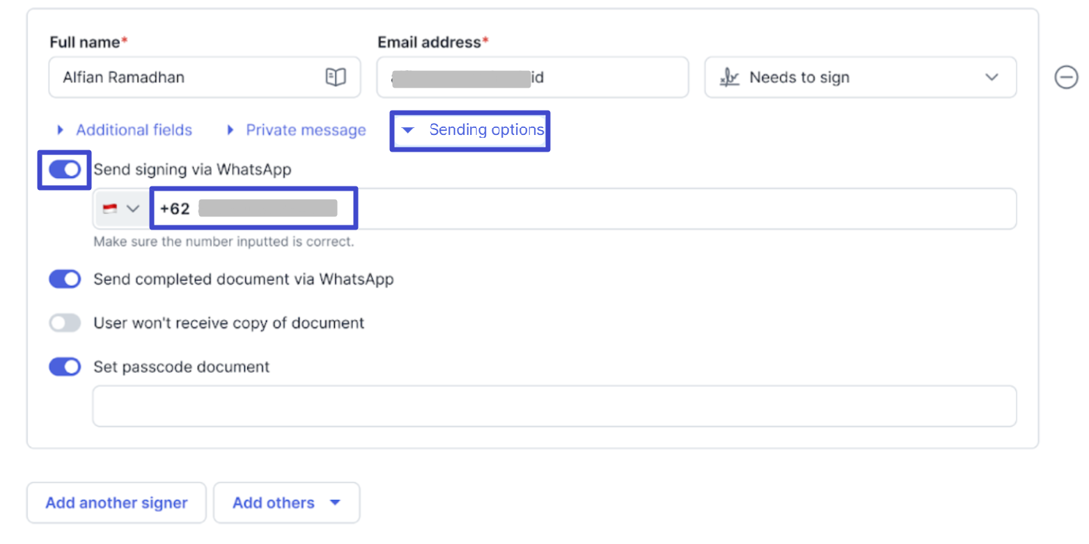 Anda juga dapat klik “Sending options” dan geser toggle Send signing via WhatsApp dan masukkan nomor telepon yang terdaftar di WhatsApp untuk mengirimkan dokumen via WhatsApp.