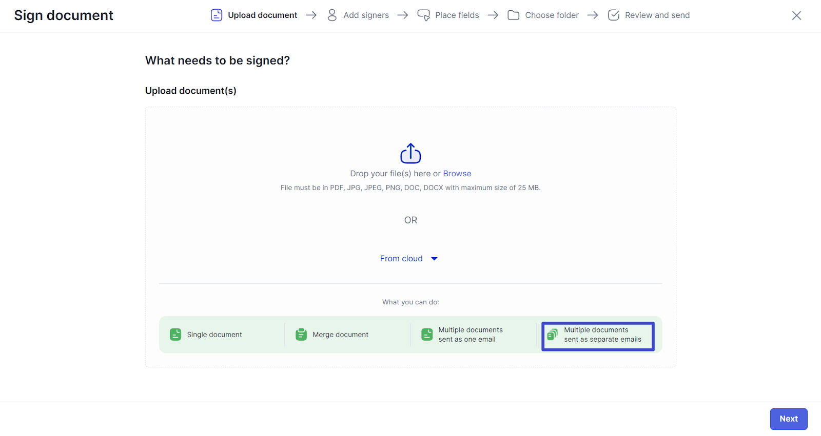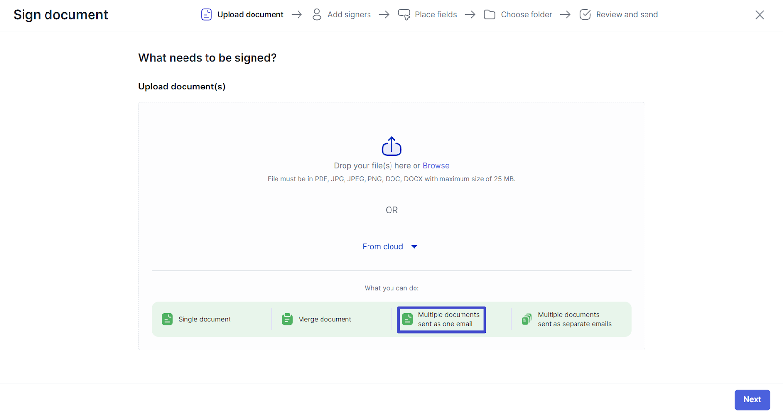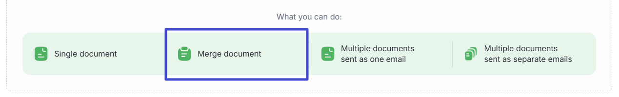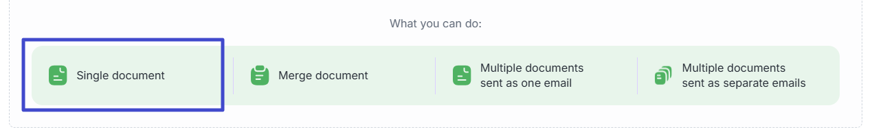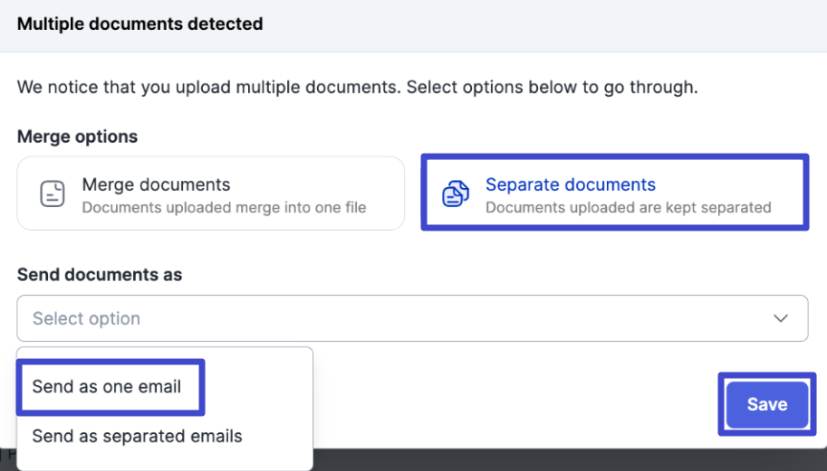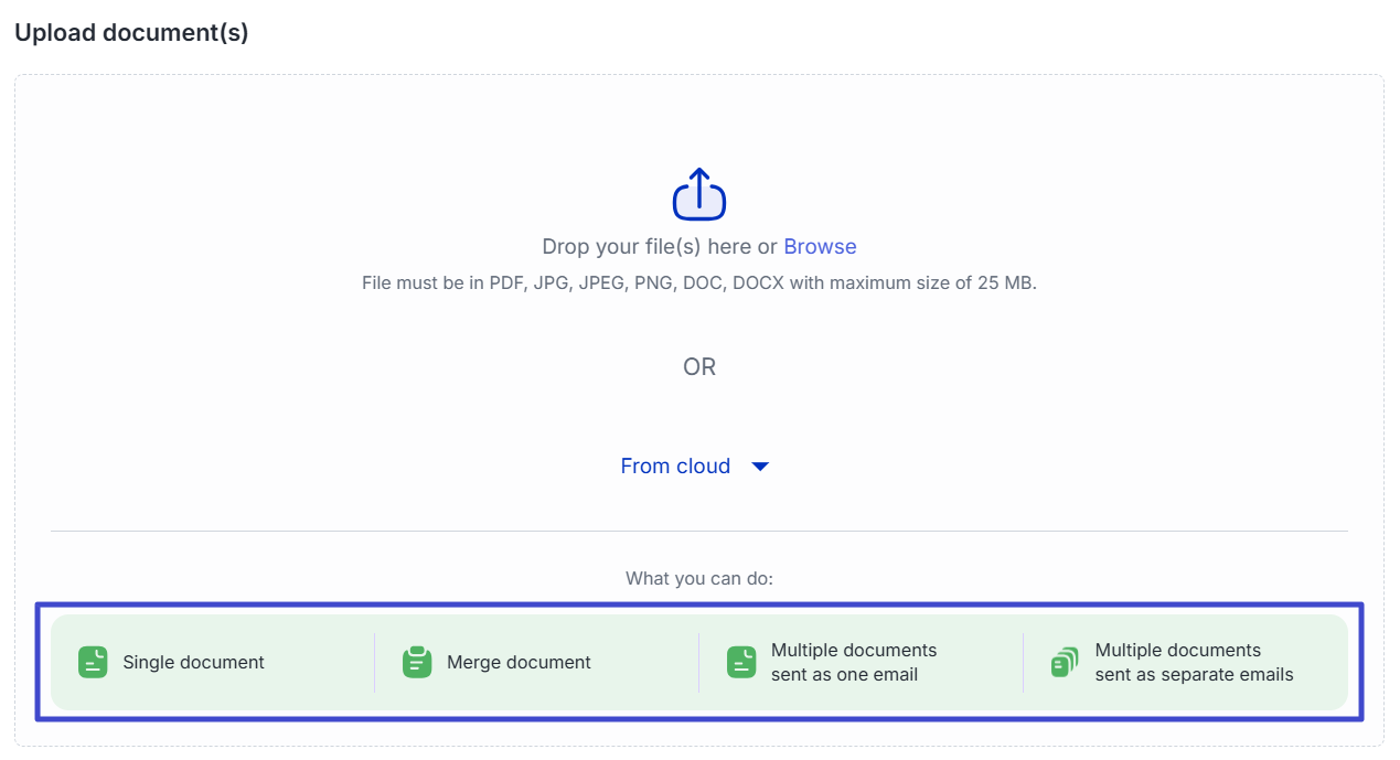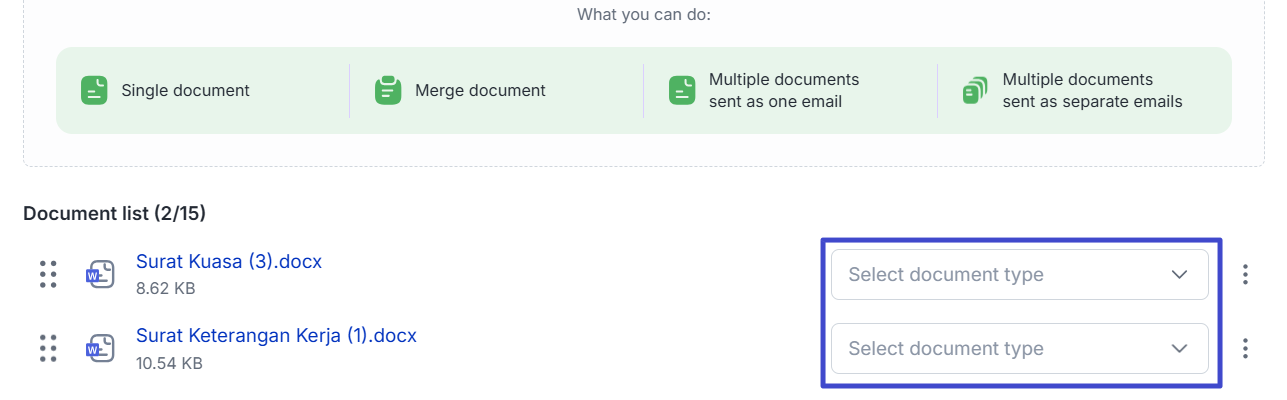 Pada tahapan ini, Anda juga dapat memilih untuk mengunggah Single document, menggabungkan dokumen (Merge document), dan mengirimkan beberapa dokumen ke satu email (Multiple documents sent as one email) serta email berbeda (Multiple documents sent as separate emails).