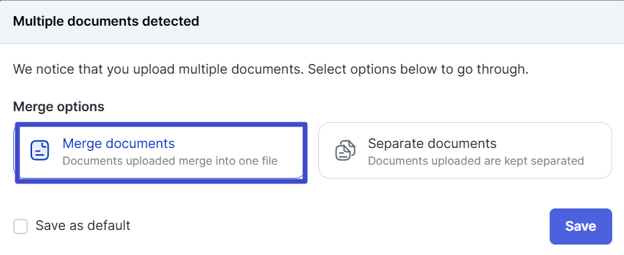 - Anda juga dapat centang ‘Save as default’ apabila Anda menginginkan pengunggahan ‘Merge documents’ untuk setiap dokumen-dokumen yang diunggah.