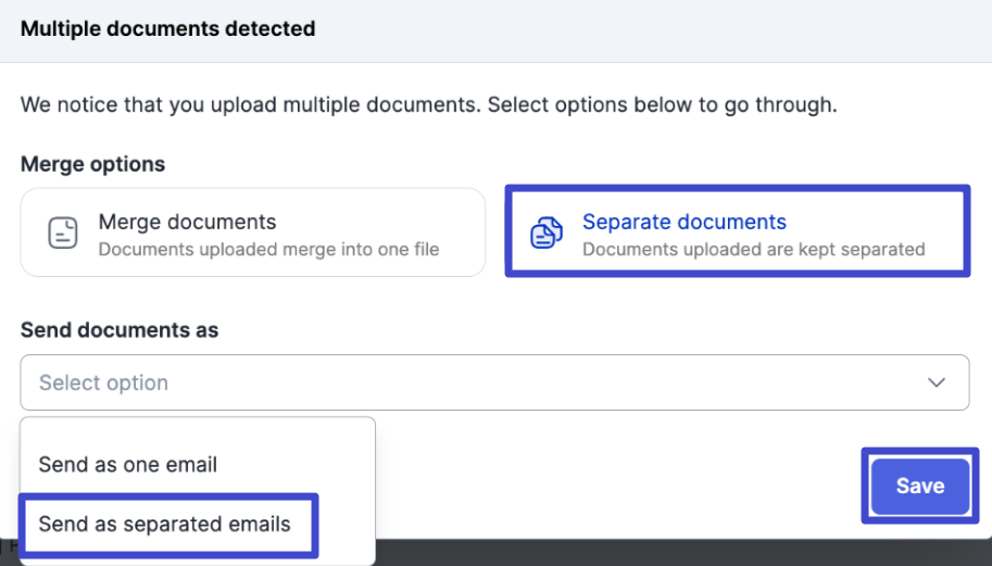 - Kemudian pilih dokumen-dokumen yang akan digabungkan untuk dikirimkan dalam email berbeda. Anda dapat klik “Merge documents” untuk menggabungkan dokumen dalam satu file, atau Anda dapat klik "Separate documents” untuk memisahkan dokumen-dokumen yang akan diunggah. Apabila Anda memilih untuk mengirimkan dokumen secara terpisah, maka Anda dapat klik “Separate documents”, lalu klik “Send as separated email” untuk mengirimkan dokumen tersebut pada email terpisah. Kemudian klik “Save”.