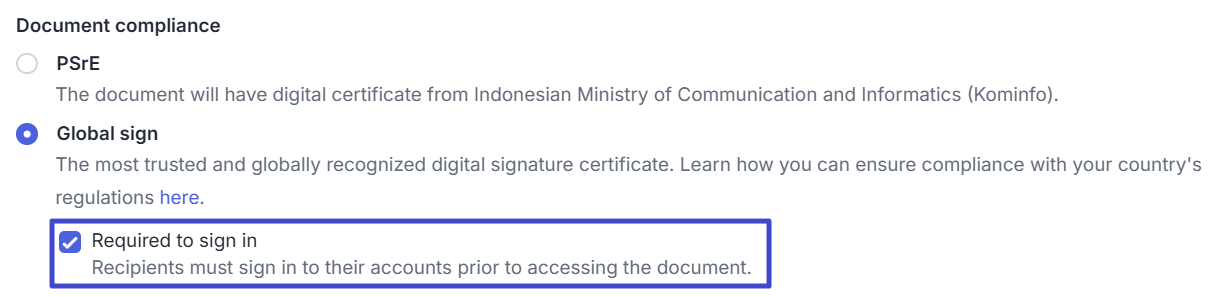 Centang Required to sign in, jika penerima harus login ke dalam akun Mekari Sign mereka untuk dapat mengakses dan menandatangani dokumen.