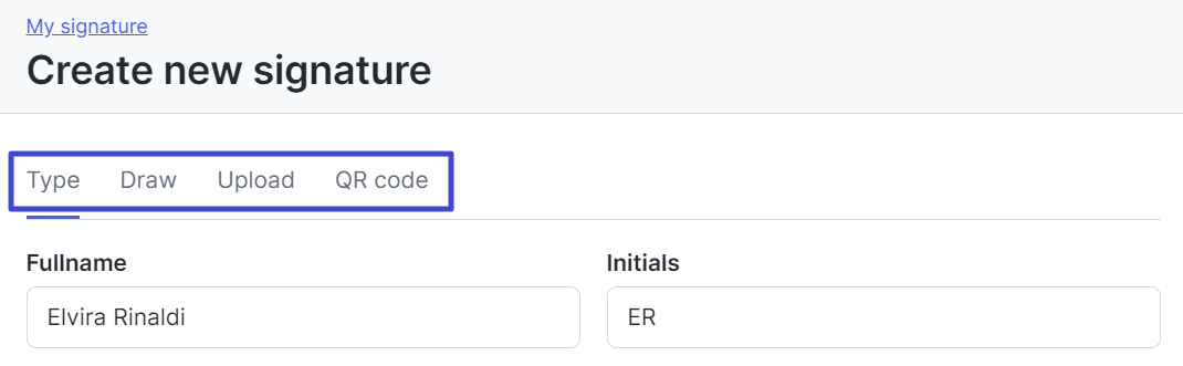 Pilih tipe tanda tangan yang ingin Anda masukkan, yaitu dalam bentuk tulisan, coretan tanda tangan, unggah tanda tangan, atau dengan menggunakan QR Code.