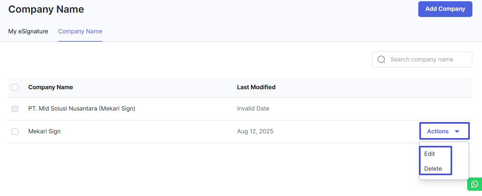 - Dan klik tombol “Add Company” untuk membuat nama perusahaan baru yang akan muncul saat penandatanganan.