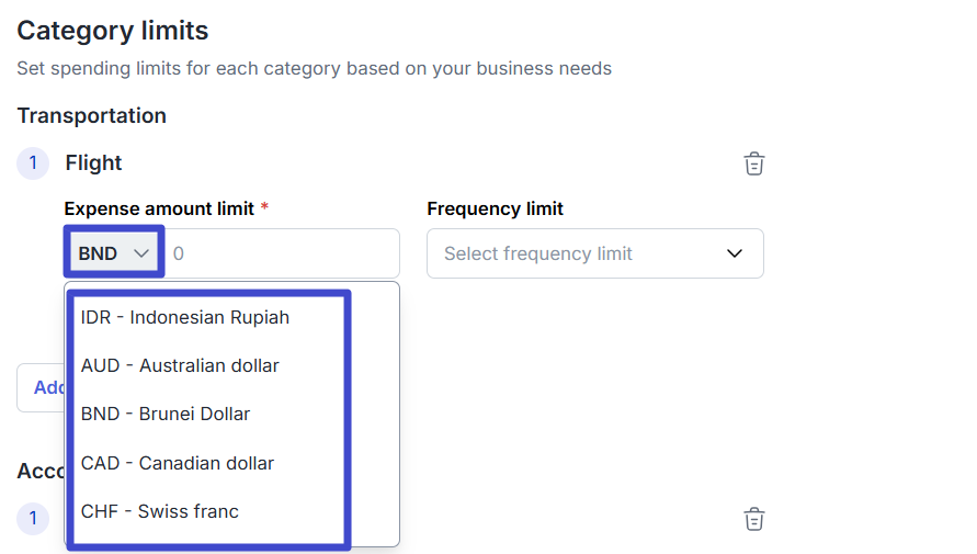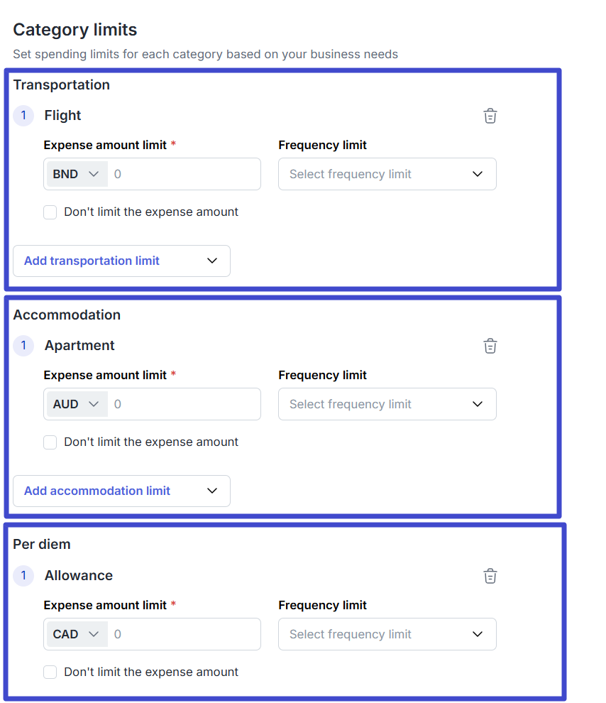 Kemudian, pilih limit kategori yang terdiri dari transportasi, penginapan, serta tunjangan harian berdasarkan kebutuhan perjalanan bisnis Anda. Tentukan batas jumlah biaya dan limit frekuensi dari masing-masing kategori. Anda dapat mencentang “Don’t limit the expense amount” jika tidak ingin membatasi jumlah biaya.